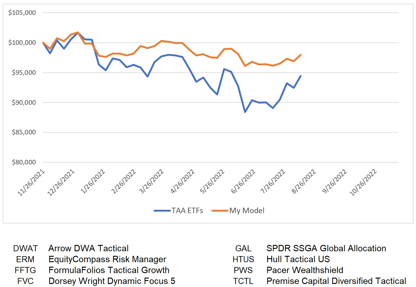 For the fun of it, I decided to compare the performance of my model since I began publishing weekly asset allocation weights here in November 2021 to the average of eight professionally managed tactical asset allocation ETFs. The period of time covered is so small that no conclusion can be drawn. I do get a level of comfort in seeing that my model had a lower drawdown than the average of the eight ETFs but it will take years of observations to determine if my model outperforms the professionally managed TAA ETFs.