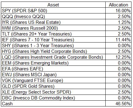My models are slowly moving into equities with the equity allocation now at 24.75%. The bond ETF allocation stands at 28.69% with the remaining 46.56% in cash.