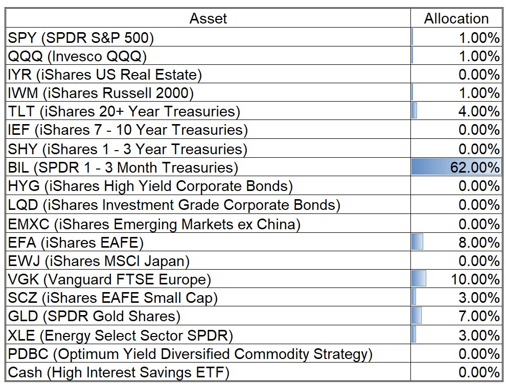 Short-term treasuries continue to be the investment of choice for my dynamic asset allocation models as they collectively have a 62% allocation to BIL.