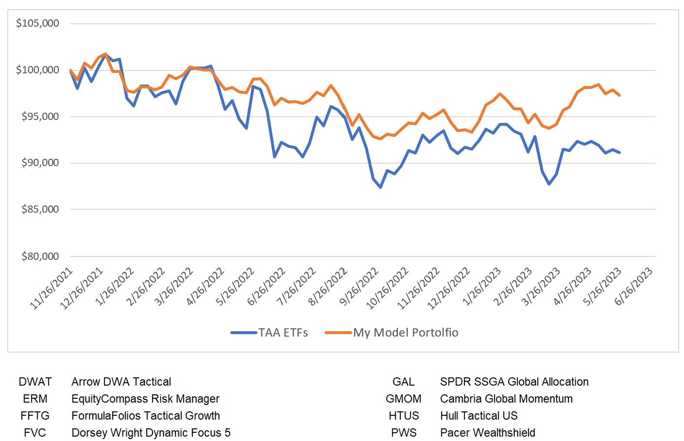 As seen in the chart below, my allocations posted here every week continue to outperform the average of eight TAA funds.