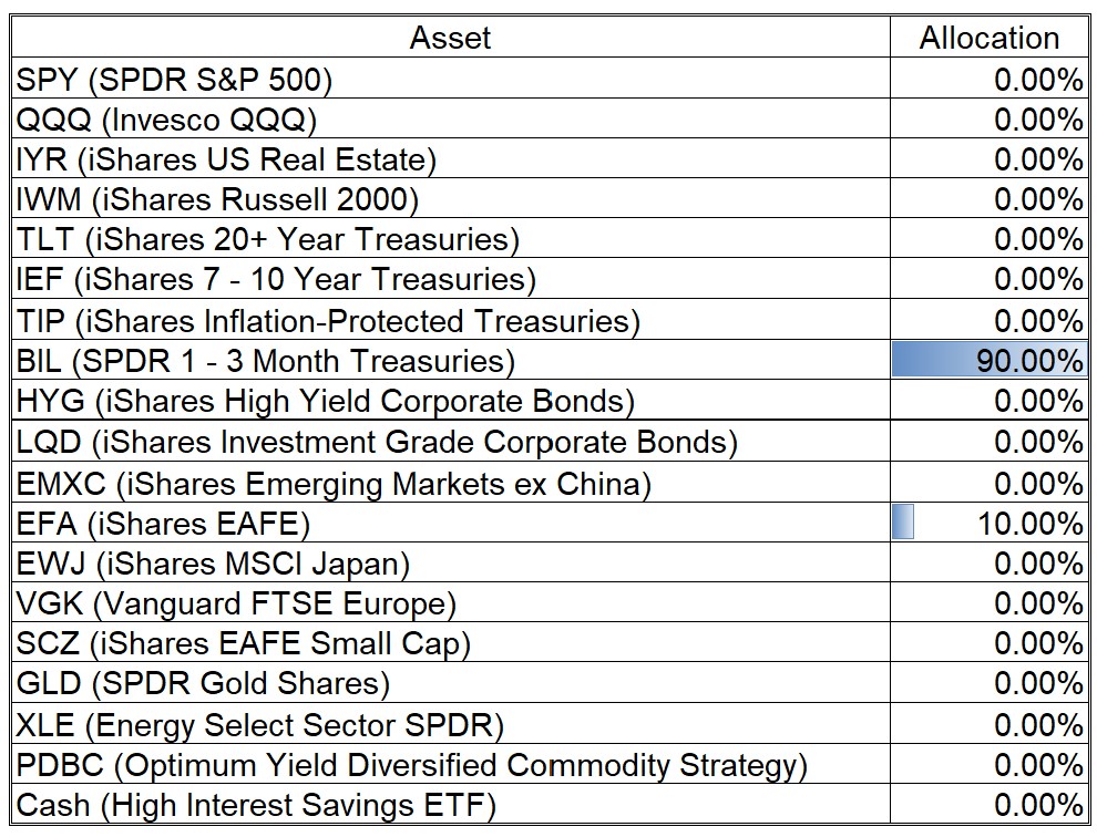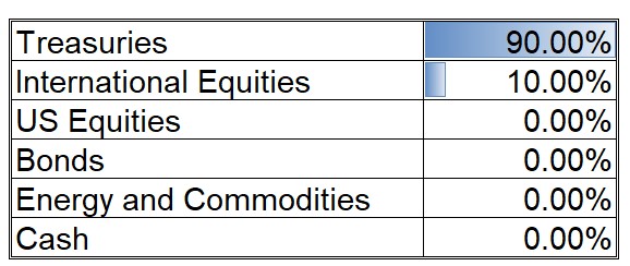My model is very cautious now with a 90% allocation to short-term Treasuries. I have to say that the allocation doesn’t feel correct but I know how well my model has performed historically so I am following it without question.
