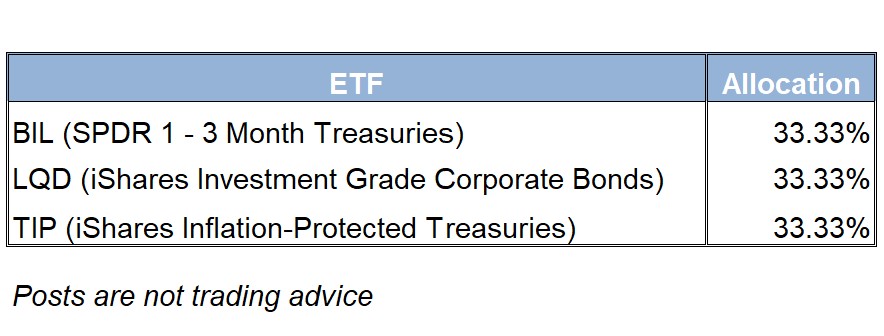 There is a change in allocations today as my model has switched to a very conservative stance with holdings in Treasuries and corporate bonds.