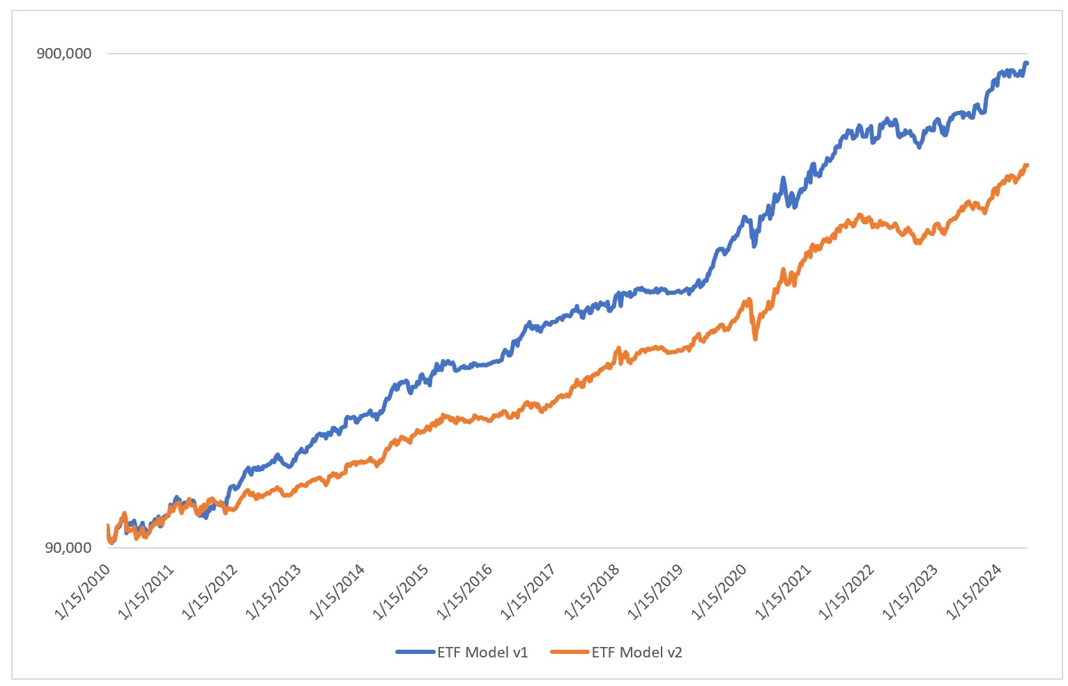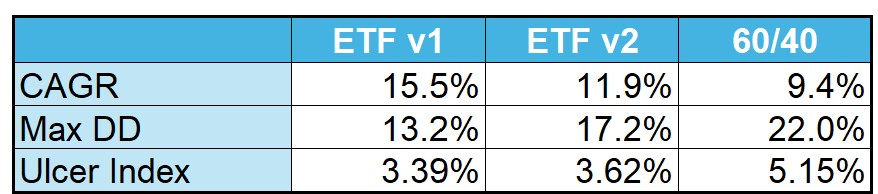 In the chart above, v1 is the system I use with only one strategy allocated at a time. v2 is a system with equal allocations to all strategies. The improvement is obvious.