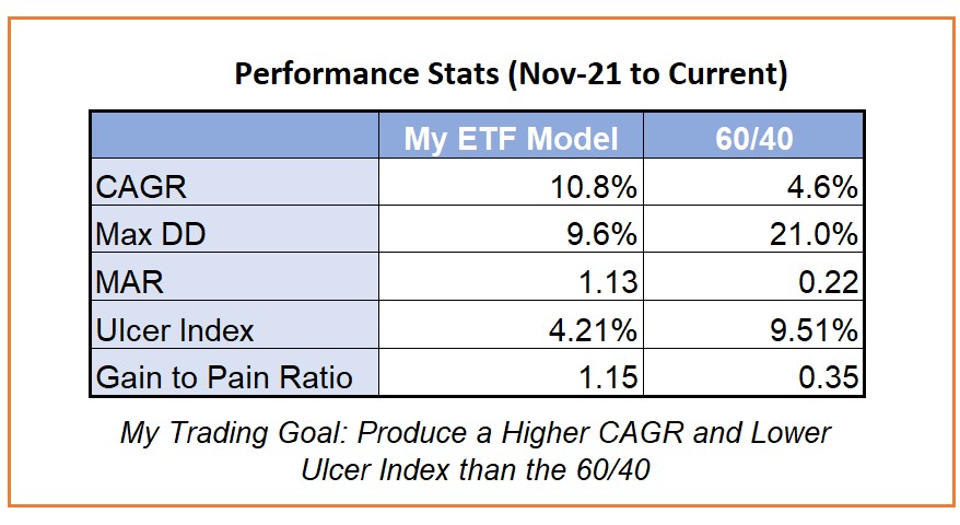 My stated goal for the ETF trading system is below the table. Producing a CAGR 6% higher than the 60/40 portfolio while having a lower maximum drawdown and a lower Ulcer Index is a nice achievement for a low-effort system. Add a 6% improvement in returns to your investment portfolio over your accumulation years and you’ll find the difference in retirement to be staggering.